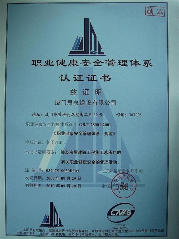 2013职业健康安全管理体系认证证书