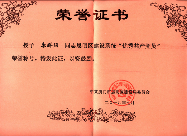 康辉阳同志2014年思明区建设系统优秀共产党员