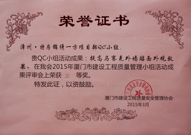 近日获悉,我司上述两个QC活动成果分别被厦门市建设工程质量安全管理协会及漳州市工程建设质量管理协会推荐参加4月17-18日由福建省建设工程质量安全管理协主办的福建省工程建设优秀QC小组活动成果发布。