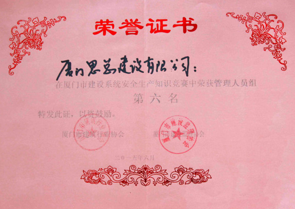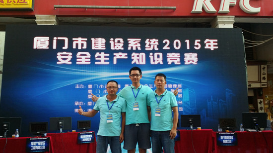 2015年6月,我司积极参加厦门市建设局、安监局、总工会、人社局等部门联合主办的“安全生产月”各项活动,并与来自在厦执业的绿色施工企业和甲级监理企业的110支参赛代表队、440名参赛人员同场竞技,先后取得“安全知识竞赛”团体第六名、“安全管理岗位技能竞赛” 林新雄个人第七名、团体四十名的较好成绩,充分展示了我司员工团结合作、拼搏向上的精神风貌。