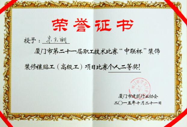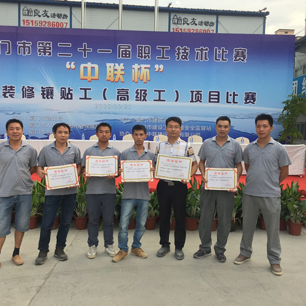 2015年10月21日上午,由厦门市建设局、市人力资源和社会保障局、市总工会主办,厦门市建筑行业协会、市建筑工程质量安全监督站、厦门中联建设工程有限公司承办的厦门市第二十一届职工技术比赛“中联杯”装饰装修镶贴工(高级工)项目比赛实操考核环节在同安区禹洲溪堤尚城7#地块隆重举行,我司代表队参赛并获佳绩。