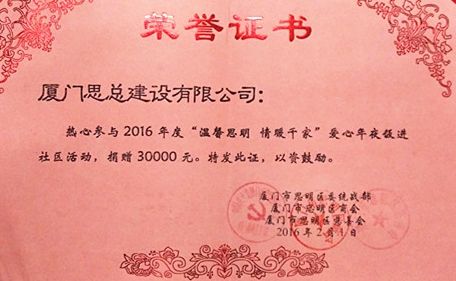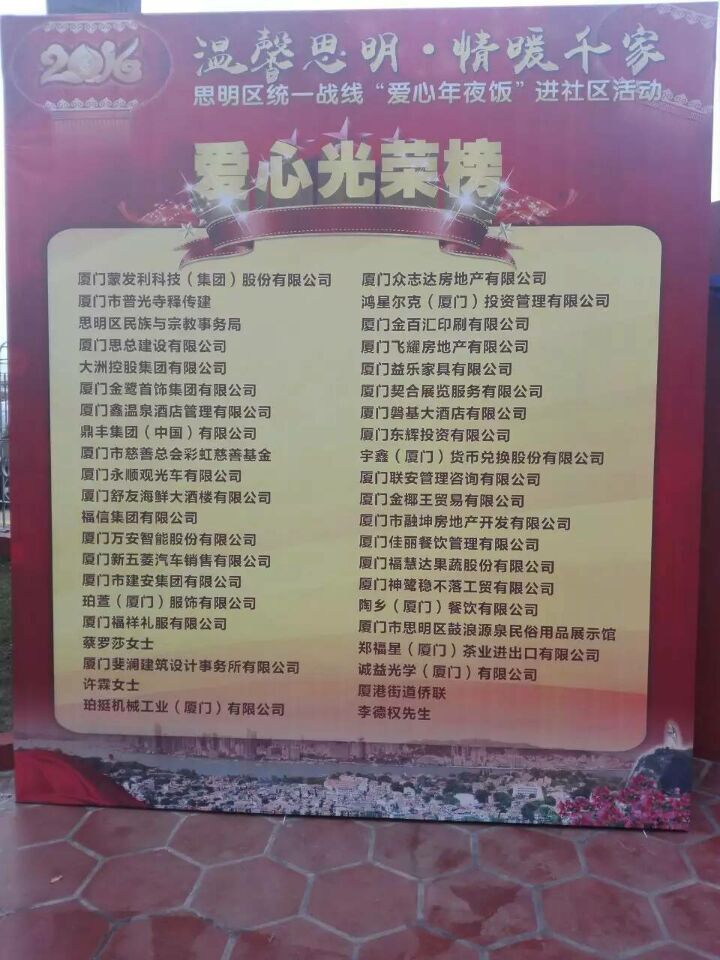 据悉,“温馨思明·情暖千家”爱心年夜饭进社区活动自开展以来颇获支持,来自社会各界的爱心人士踊跃参与。我司作为思明区的一员,一直以“根植思明,反哺思明”为己任,多年来积极投身社会慈善事业,继承和发扬“积德行善、扶贫济困”的中华传统美德,为思明区统一战线凝神聚力,积极承担建设“美丽厦门”的社会之责。