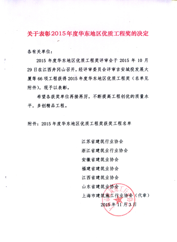 近日,2015年度华东地区优质工程奖——“华东杯”获奖名单公布,我司承建的九牧王营运中心项目获此殊荣,这是继2014年打叶复烤生产线技术改造项目联合工房获奖以来,我司再添此项荣誉。