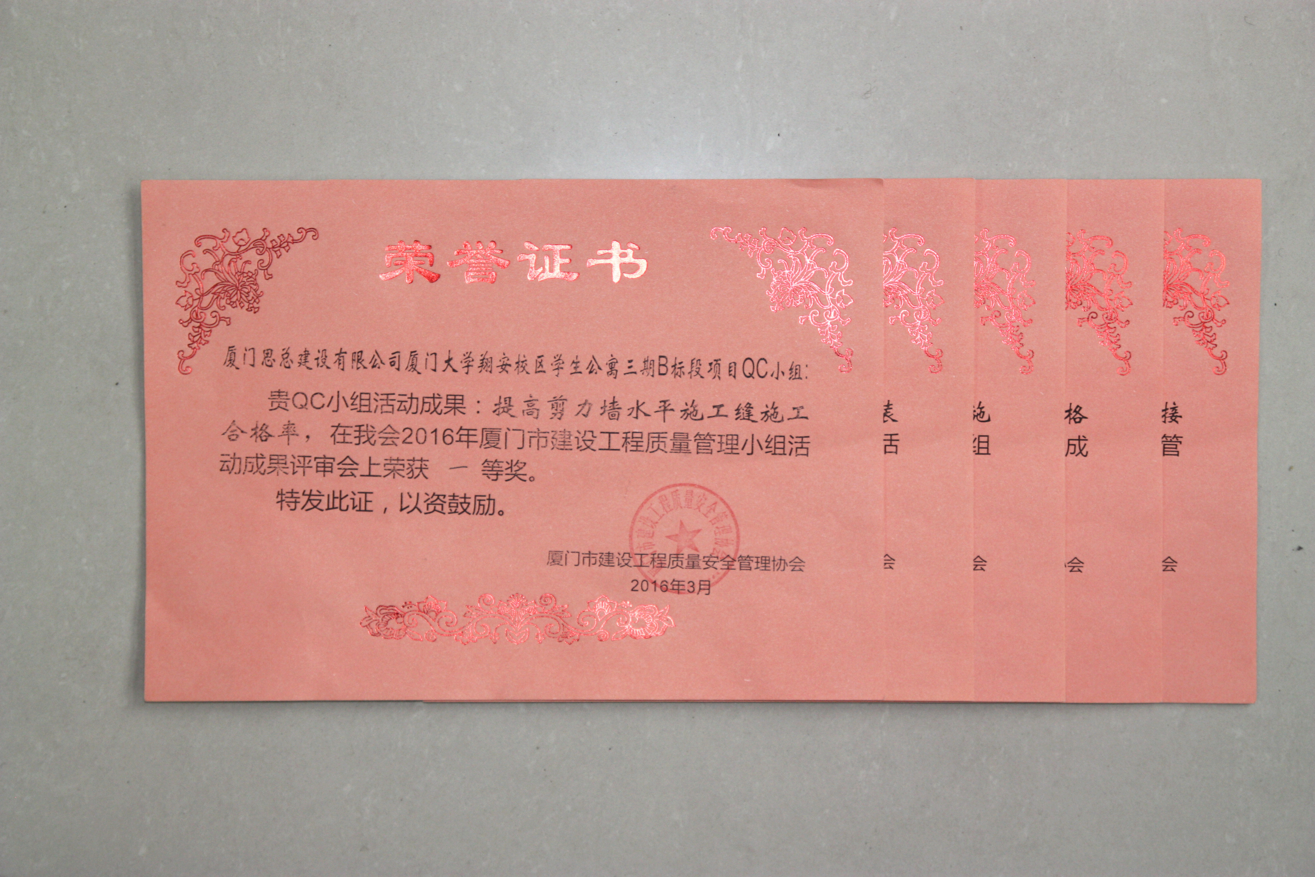 2016年3月16日,厦门市建设工程质量安全管理协会举办的“2016年厦门市建设工程质量管理小组活动成果评审会”在白鹭洲大酒店举行,共有110个QC成果参加发布,评委专家预审选出30项进行现场点评。我司参加发布的5个QC成果分获一等奖1个、二等奖2个、三等奖2个;其中厦门大学翔安校区学生公寓三期B标段项目QC小组活动成果《提高剪力墙水平施工缝施工合格率》及建发.央郡项目QC小组活动成果《提高外墙内保温砂浆一次施工合格率》还做为厦门市优秀QC成果被推荐参加2016年4月11日在福州举办的福建省工程建设优秀QC小组活动成果发布,并在参赛的234个QC成果中脱颖而出,两个项目均获得省QC小组活动成果发布会一等奖。