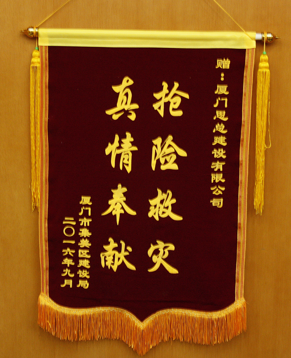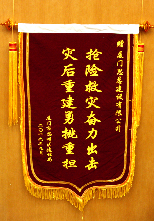 近日,思明区建设局、集美区建设局相继授予我司“抢险救灾奋力出击,灾后重建勇挑重担”和“抢险救灾,真情奉献”的锦旗,对我司参与灾后救援工作给予肯定和表彰。