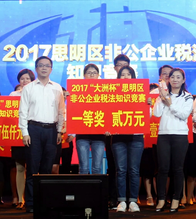 2017年11月18日下午,思明区非公企业税法知识竞赛在厦门电视台演播大厅隆重举行,来自思明区街道基层商会会员企业组成10支代表队参与竞赛,我司员工邓惠丽做为滨海街道商会代表队的一员参赛。为了备战本次比赛,邓惠丽在繁重的日常工作之余,认真学习国务院减税政策,仔细研读“营改增”税法知识。比赛当天,邓惠丽与其他两名队友分工协作、紧密配合,最终以必答题、共答题满分,抢答题、风险题高分的优势脱颖而出,取得了一等奖的佳绩。