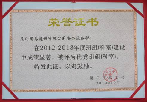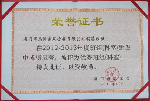 2013年12月06日市总工会在市总多功能厅举行市级“工人先锋号”、“五一先锋岗”、“优秀班组长”、“节能减排职工标兵”命名暨优秀班组(科室)表彰大会,我司工会荣获先进工会劳动保护监督检查委员会、安全部荣获优秀班组(科室)、项目部钢筋班组荣获“工人先锋号”、项目部劳务队长黄文章荣获“优秀班组长”等光荣称号。