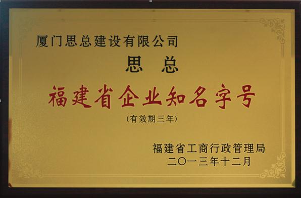 公司自成立伊始,就坚持诚信履约、守法经营,依靠产品品质和企业信誉树立企业品牌。近年来,积极构建以“诚信、品质”为核心的企业文化,企业商标被延续认定为“厦门市著名商标”、“福建省著名商标”,“思总”字号再次被福建省工商行政管理局授予“福建省企业知名字号”(有效期三年);并获国家工商总局授予“2012~2013年度全国守合同重信用企业”(公示)。 企业品牌影响力不断扩大,业务已拓展到省内各地及省外的江苏、四川等地,在省市行政主管部门、行业协会组织的企业信用、综合业绩排名中一直名列前茅,自2006年以来连续9年荣登“厦门企业100强” 排行榜。