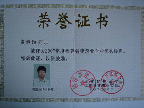 康辉阳同志2007年福建省建筑业企业优秀经理