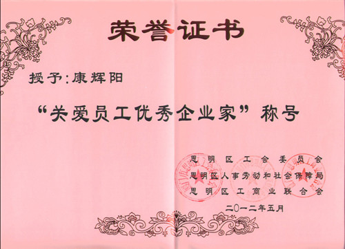康辉阳同志2012年厦门市关爱员工优秀企业家称号