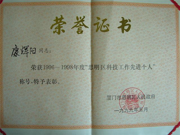康辉阳同志1996-1998年度思明区科技工作先进个人