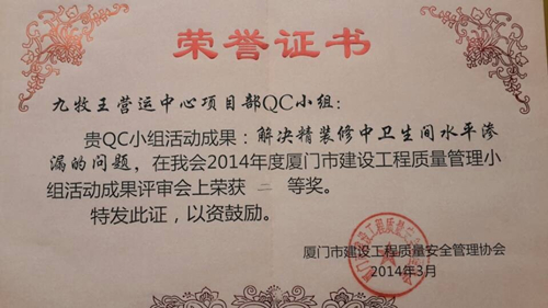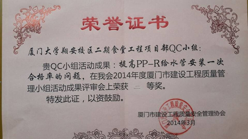近日,从2014年度厦门市建设工程质量管理小组活动成果评审会传来喜讯,我司申报的九牧王营运中心项目QC成果《解决精装修中卫生间水平渗漏的问题》和厦门大学翔安校区二期食堂工程项目QC成果《提高PP-R给水管安装一次合格率的问题》双双荣获二等奖。